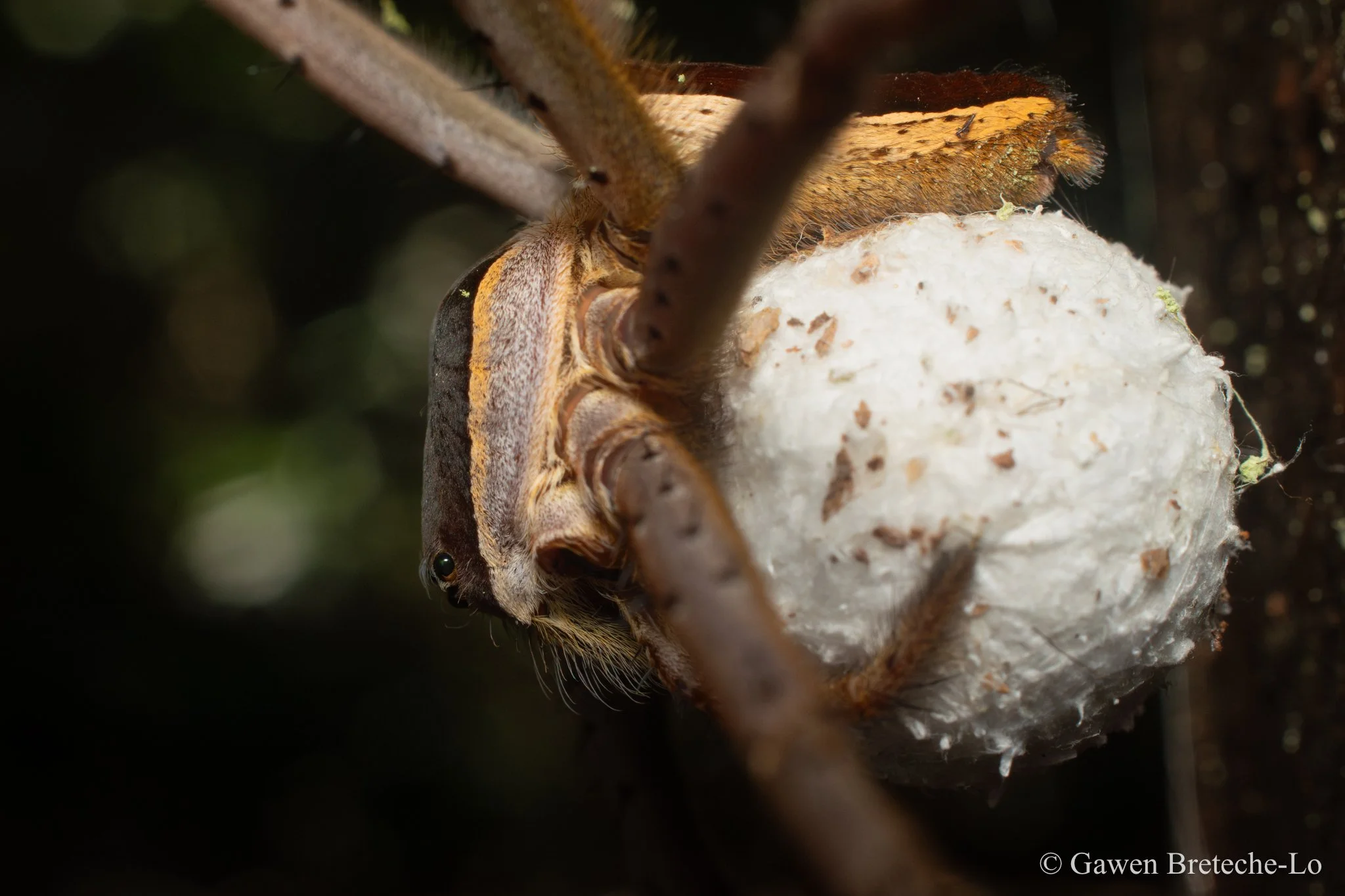 Fishing Spider guarding egg sac (Nilus albocinctus), Sarawak, Borneo 2021