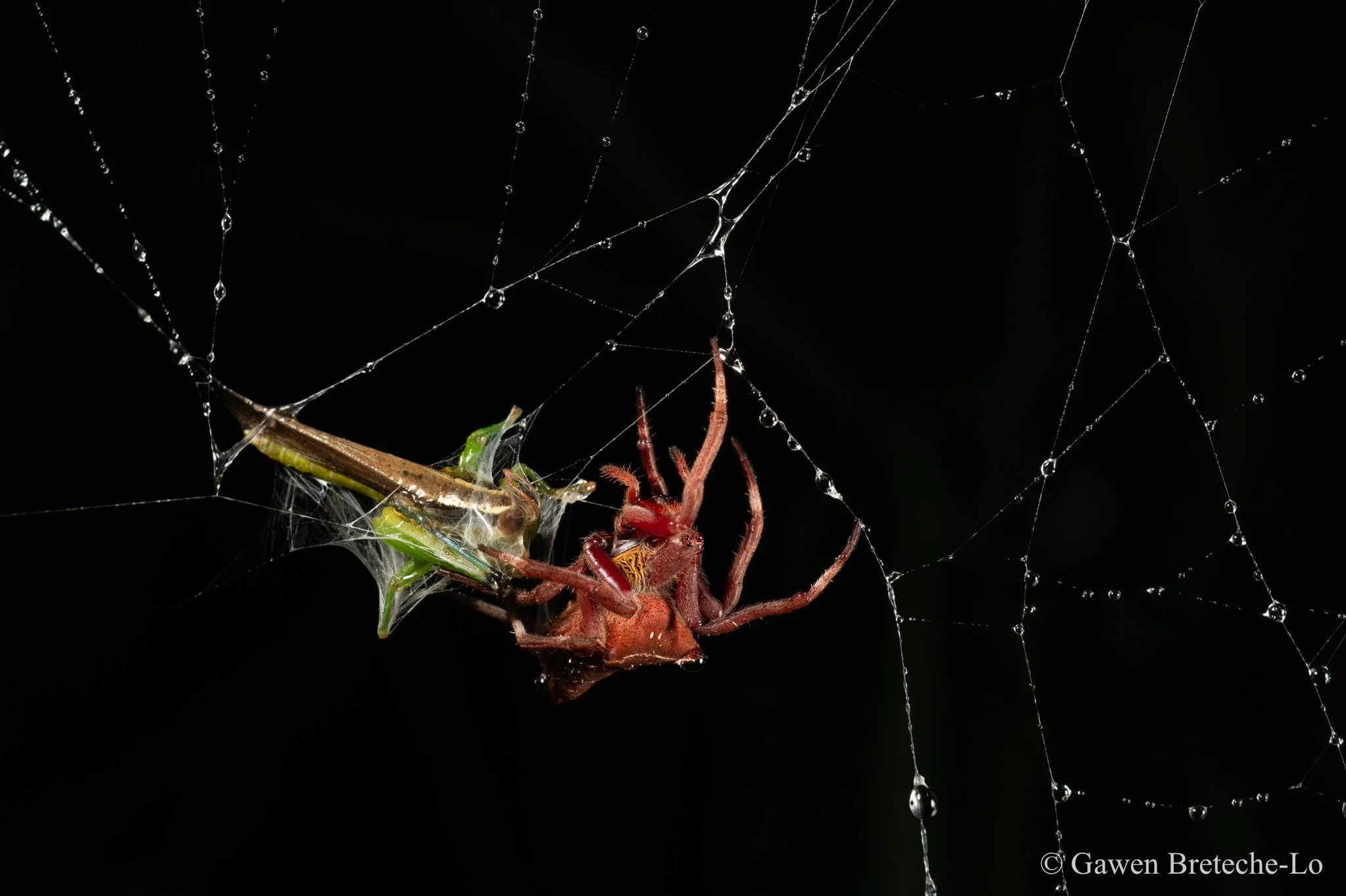 Orbspider with grasshopper prey (Parawixia sp.), Sarawak, Borneo 2023
